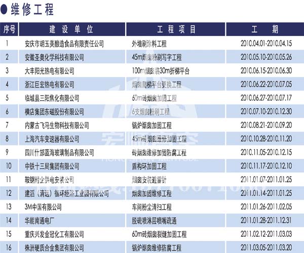 宏順建設(shè)工程有限公司是國家批準(zhǔn)成立的專業(yè)高空作業(yè)企業(yè):承攬過(國內(nèi).國外)煙囪新建、煙囪防腐、吊機(jī)防腐、水塔防腐、管道防腐、龍門吊防腐、儲存罐防腐、煙囪內(nèi)壁防腐等高空作業(yè)工程。具有“不搭腳手架 、 不需要停產(chǎn)”施工特點(diǎn)。